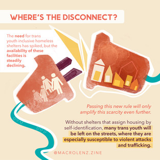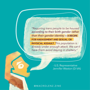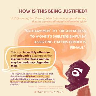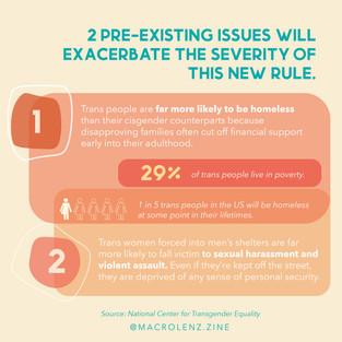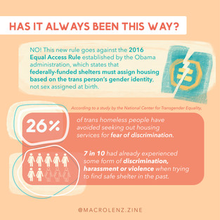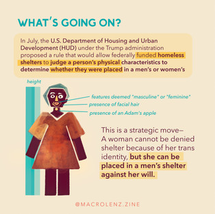 last month, the HUD announced a proposed rule that would permit homeless shelters to put trans people in houses based on their birth-assigned sex. not only does this go against the 2016 Equal Access Rule, but it creates extremely unsafe and uncomfortable conditions for trans people. swipe to learn more about this issue and ways you can help.