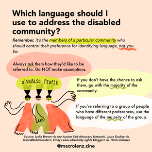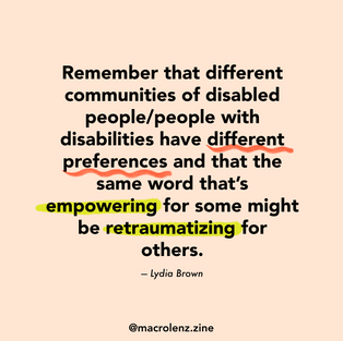 Though #disabilitypridemonth is only a month long, terminology and trends in language last much longer. The way we use language affects those around us — in our immediate communities and in society at large. Trends in language have the power to transform societal ideas and attitudes, so please be mindful and respectful when addressing the disabled community especially since this is a sensitive topic for many.